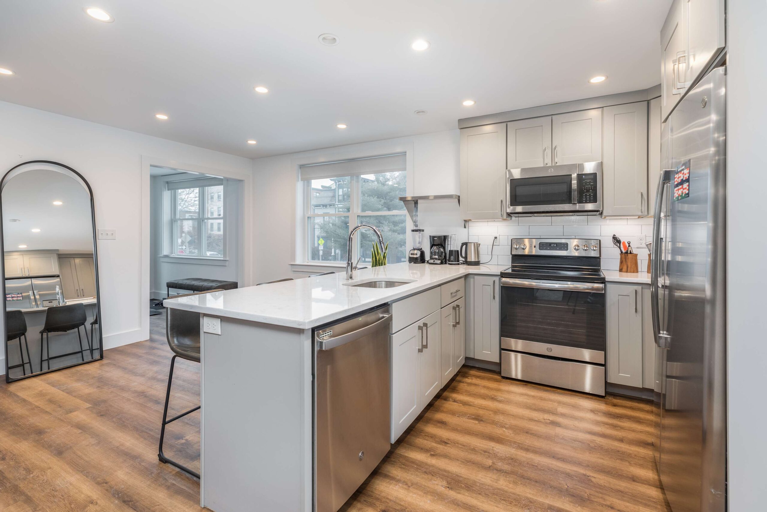 The kitchen is equipped with stainless steel appliances including a refrigerator, stove, microwave, and dishwasher — everything you need to cook and eat within your own space.